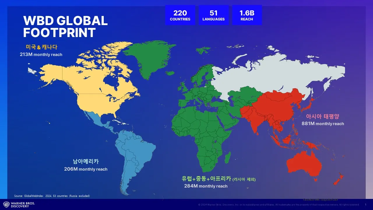 Warner Bros. Discovery(WBD)는 총 220여 개 국가 & 50여 개 언어로 방송되는 ‘리얼 라이프 엔터테인먼트’의 글로벌 리더입니다. 세계 최대의 다큐멘터리 채널인 DISCOVERY를 비롯하여, 유럽 전역을 커버하는 유일한 스포츠채널 EUROSPORT, 라이프스타일 채널 TLC, 과학채널 DISCOVERY SCIENCE, 여행채널 TRAVEL CHANNEL, 음식 문화 채널 FOOD NETWORK 등을 보유하고 있습니다. 다양한 다큐멘터리와 브랜드 콘텐츠를 제공합니다.